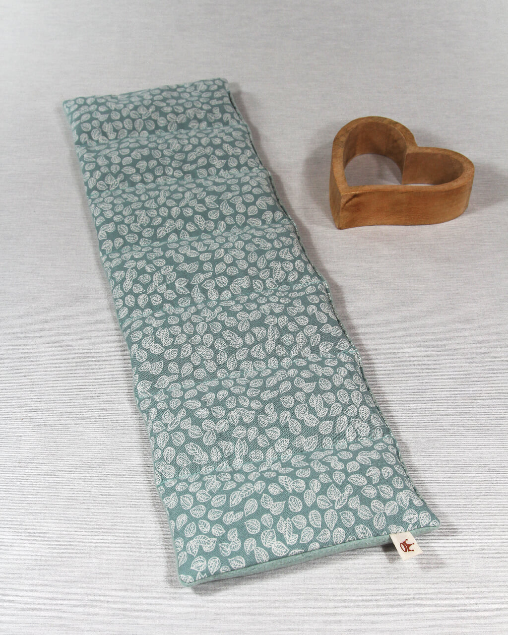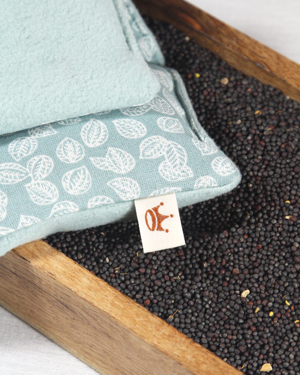 Das Wärmekissen hat 7 Kammern, ist in modernem Blätterdesign in der aktuellen Farbe Salbei. Mit der kuscheligen Rückseite aus Baumwollfleece. Für die lange Wärmeabgabe durch den feinen Rapssamen.